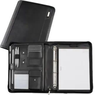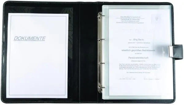 Die Alassio Ringbuchmappe für DIN A4 in elegantem Schwarz vereint Funktionalität und stilvolles Design. Sie ist die ideale Lösung für alle, die ihre Dokumente professionell und übersichtlich aufbewahren möchten. Mit den Maßen von 28,0 x 4,5 x 36,0 cm passt diese Mappe perfekt in jede Aktentasche oder jeden Rucksack, wodurch sie sich ideal für den Einsatz im Büro, bei Meetings oder unterwegs eignet. Hergestellt aus hochwertigem Lederimitat, bietet die Alassio Ringbuchmappe nicht nur eine ansprechende Optik, sondern auch eine angenehme Haptik. Das robuste Material sorgt dafür, dass Ihre Unterlagen sicher und geschützt sind, während die schlichte schwarze Farbe zeitlos und vielseitig ist. Die Mappe ist speziell für das Format DIN A4 konzipiert, sodass Sie Ihre Dokumente problemlos ablegen können, ohne dass sie knicken oder beschädigt werden. Ob für Präsentationen, wichtige Besprechungen oder die tägliche Organisation – die Alassio Ringbuchmappe ist ein unverzichtbares Accessoire. Sie verfügt über ausreichend Platz für Ihre Unterlagen, während sie gleichzeitig einen professionellen Eindruck hinterlässt. Obwohl die Mappe keine speziellen Stifteschlaufen bietet, können Sie problemlos zusätzliche Schreibutensilien in Ihrer Tasche unterbringen. Die Alassio Ringbuchmappe ist nicht nur funktional, sondern auch ein stilvolles Statement. Sie überzeugt durch ihre schlichte Eleganz und ist der perfekte Begleiter für jeden, der Wert auf eine ordentliche und ansprechende Präsentation seiner Dokumente legt. Mit der Alassio Ringbuchmappe für DIN A4 schwarz entscheiden Sie sich für Qualität und Stil, die Ihren Anforderungen gerecht werden.